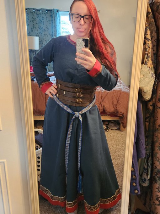 Got my new wool dress for the #NordicFireFestival in Feb. Leather belt with it was too big (yay?), but not the worst problem to have when you're a leatherworker and can customize it yourself. Thanks #Armstreet! 🇺🇦 🩵 #cosplay #costuming #viking #shieldmaiden #diy #leathercraft