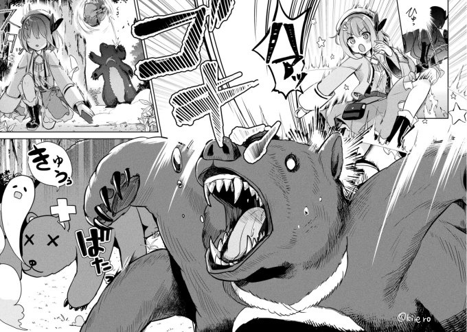 新米錬金術師の店舗経営3話おつかれさまでした! イラストはコミカライズ版2巻より熊さんを蹴り斃すサラサです🐻 またアニメとは違った感じになっておりますので是非コミカライズ、原作小説と読み比べてみてくださいね💪 #shinmai_renkin