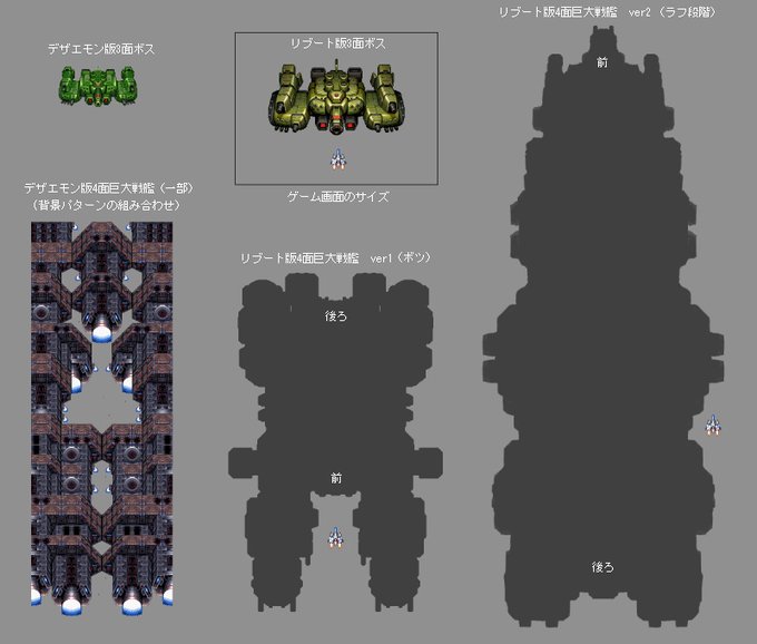 4面の巨大戦艦、ドット絵一応完成してたけど、実際に仮表示してみると、スケール感が足りない等の問題が発覚して、全部描き直し中…。まだラフ段階だけど、大きすぎて終わる気配がない…😇(当面はこの作業予定) #デビルブレイド #DevilBlade #Shmups