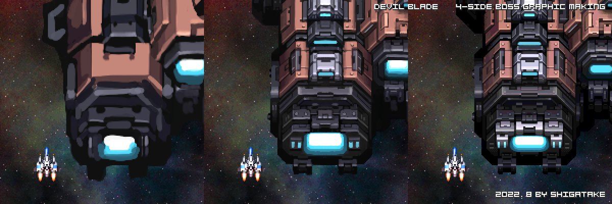 4面ボスのグラフィックメイキング的なやつ ①なんかいい感じに大雑把な形状を描く ②なんかいい感じに細部の形状を描く ③なんかいい感じにドット単位で描く #デビルブレイド #DevilBlade #Shmups