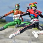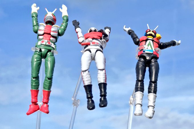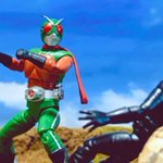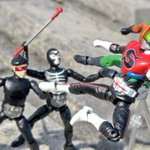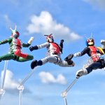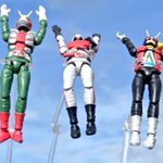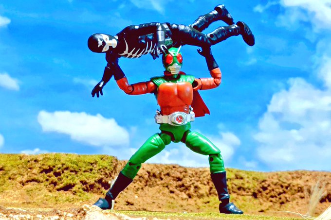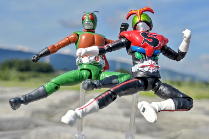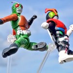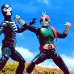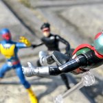 「新」繋がりでとおもったのですが、各ライダーの必殺技を連携技で出来ればと試みました🎵 竹トンボシュート!&ライダーきりもみシュート! 他のライダーも機会があればやってみたいですね( ´∀`) #仮面ライダー #仮面ライダー新1号 #スカイライダー #特撮 #掌動 #shodo仮面ライダー #オモ写