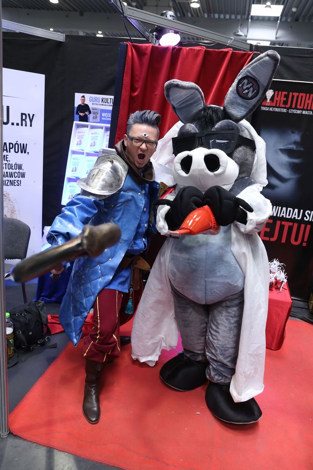 Rok 2015, Kołcz Majk jako Mentalmanta (postać w grze planszowej Labirynth) tuż obok osiołka Ici Ici, który w 2022 przekształcił się NFT @pyrkon #sifi #3d #awatar #cosplay #gurukultury #iciici #zakazstękania