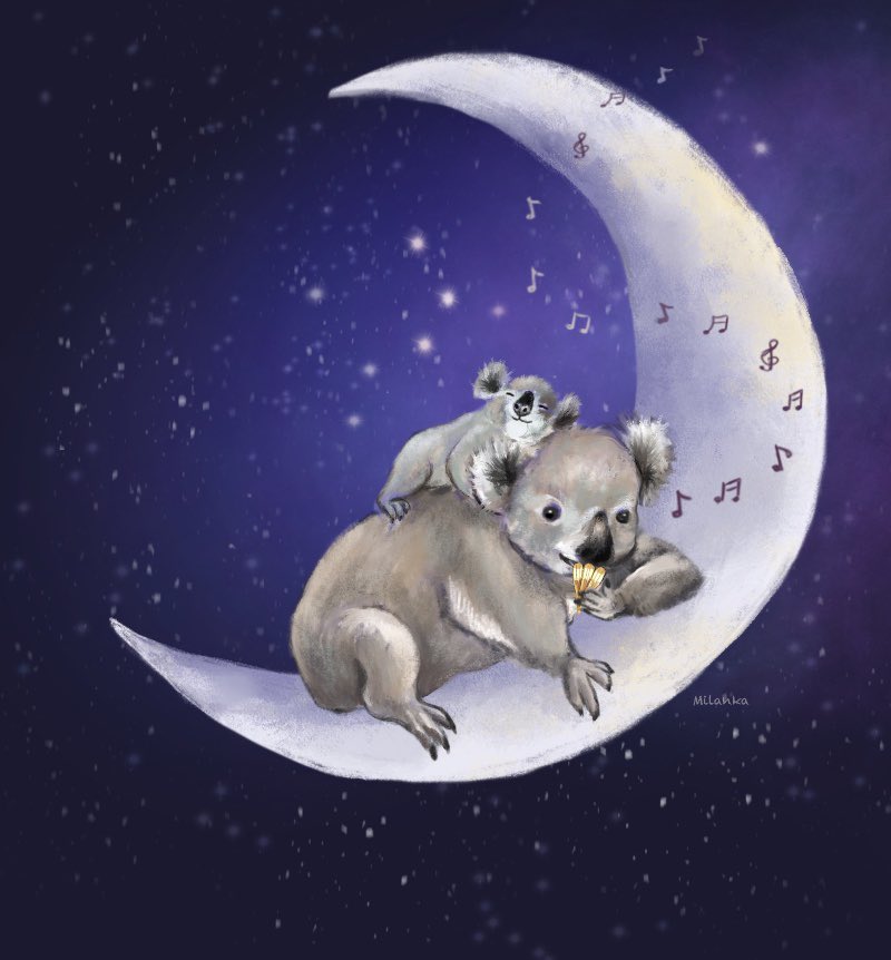 K is for koala enjoying the sweet sounds of her mama playing the Kouxian (Chinese term for any type of jaw harp, a wind instrument) @AnimalAlphabets #AnimalAlphabets #colour_collective #colour #SilverBirch #koala #music #moonlight #illustration #art #kidlitart #paintings #kidlit