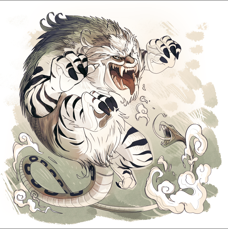Inktober 13 (jour 17) : « Un #nue (鵺) est une créature fantastique: la tête d'un #singe, le corps d'un #chien viverrin, les pattes d'un #tigre et un #serpent à la place de la queue. Un nue peut aussi se transformer en nuage noir et voler. #yokaitober #inktober #inktober2021
