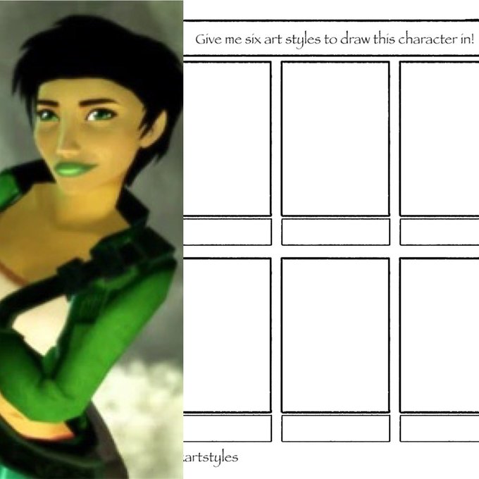 Give me six art style you want me to draw Jade in! I want a good variety of styles. They can be based on cartoons, artists, anime (be specific), comics, video games, etc. #ArtistOnTwitter #sixfanarts #sixartstyles #beyondgoodandevil #jade