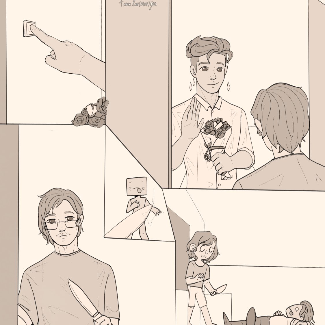 i was too lazy to color :v Skeppy: surprise Bad by suddenly appearing in front of house Bad: opened the door with a knife because he was making chicken soup #skepyfanart #skeppy #badboyhalofanart #badboyhalo #happyduo #happytwt