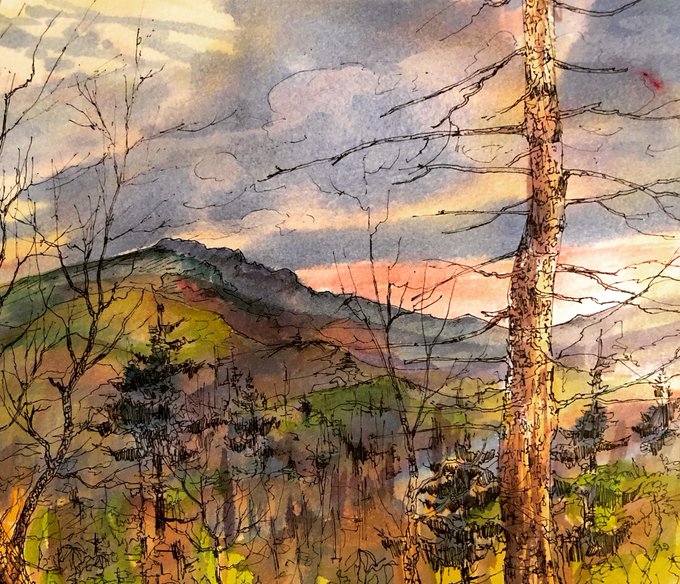 “Profile View with Pine, Grandfather Mountain” pen & ink w/ #watercolor #landscapepainting #sketchbookdrawing #ncartists #weswaugh #boonenc #americanjourneywatercolor #grandfathermtn #grandfathermountain @CheapJoesArt