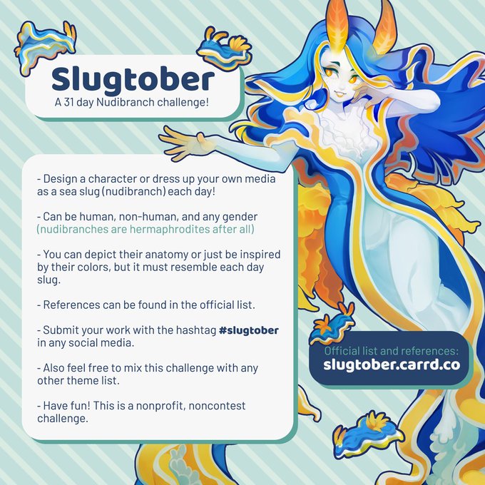 #slugtober arrives! A 31 day Sea Slug challenge. Design or dress up an OC with vibrant nudibranch motifs. Check the official list and refs here: slugtober.carrd.co