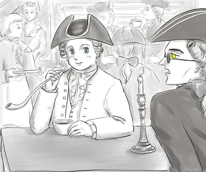 18世紀のロンドンコーヒーハウス 😈こんなところで何してるんだ 👼コーヒーハウスは情報収集にいいんだよ 😈うまいか? 👼ほら周りに馴染まないといけないし… まあ、味わい深いね ほら新しく出来たことはよく知っておく必要が… #チャレンジワンドロ1119から1120 #GoodOmensFanArt #smoking