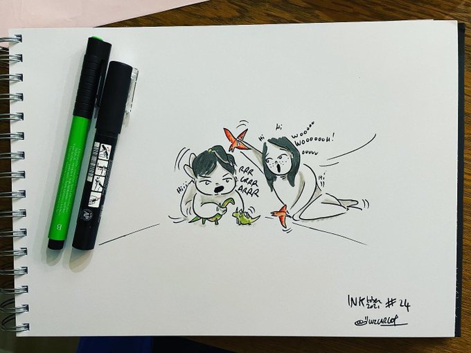 Thème extinction #24 Si si ça arrive que #lamini et #lasupermini jouent ensemble, et que seuls les dinosaures s’entretuent ! #inktober #inktober2021 #dinosaure #extinction #enfants #soeurs #luzcargot