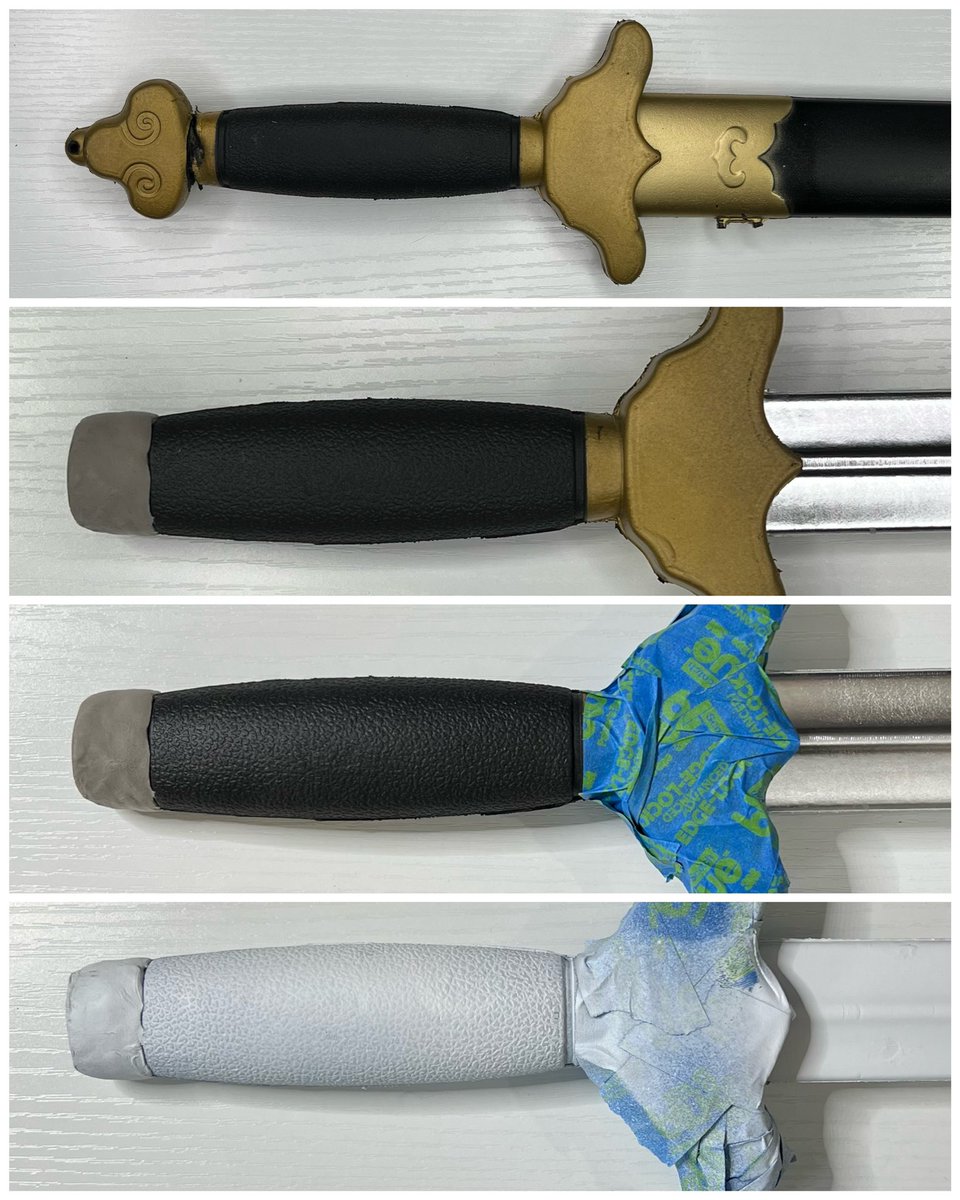 Slowly making progress on reshaping the sword hilt! Cut off the pommel, filled in the edge with foam clay, and now it’s time to prime and paint #cosplaywip #sokkacosplay