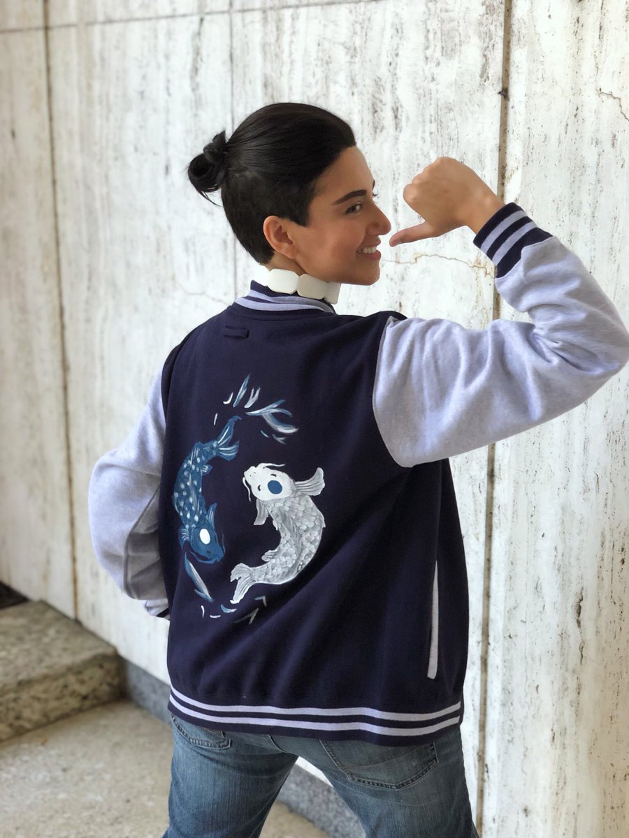 I really should wear this jacket more often after I spent a week hand painting these fishies Based on art by @Punziella #sokkacosplay