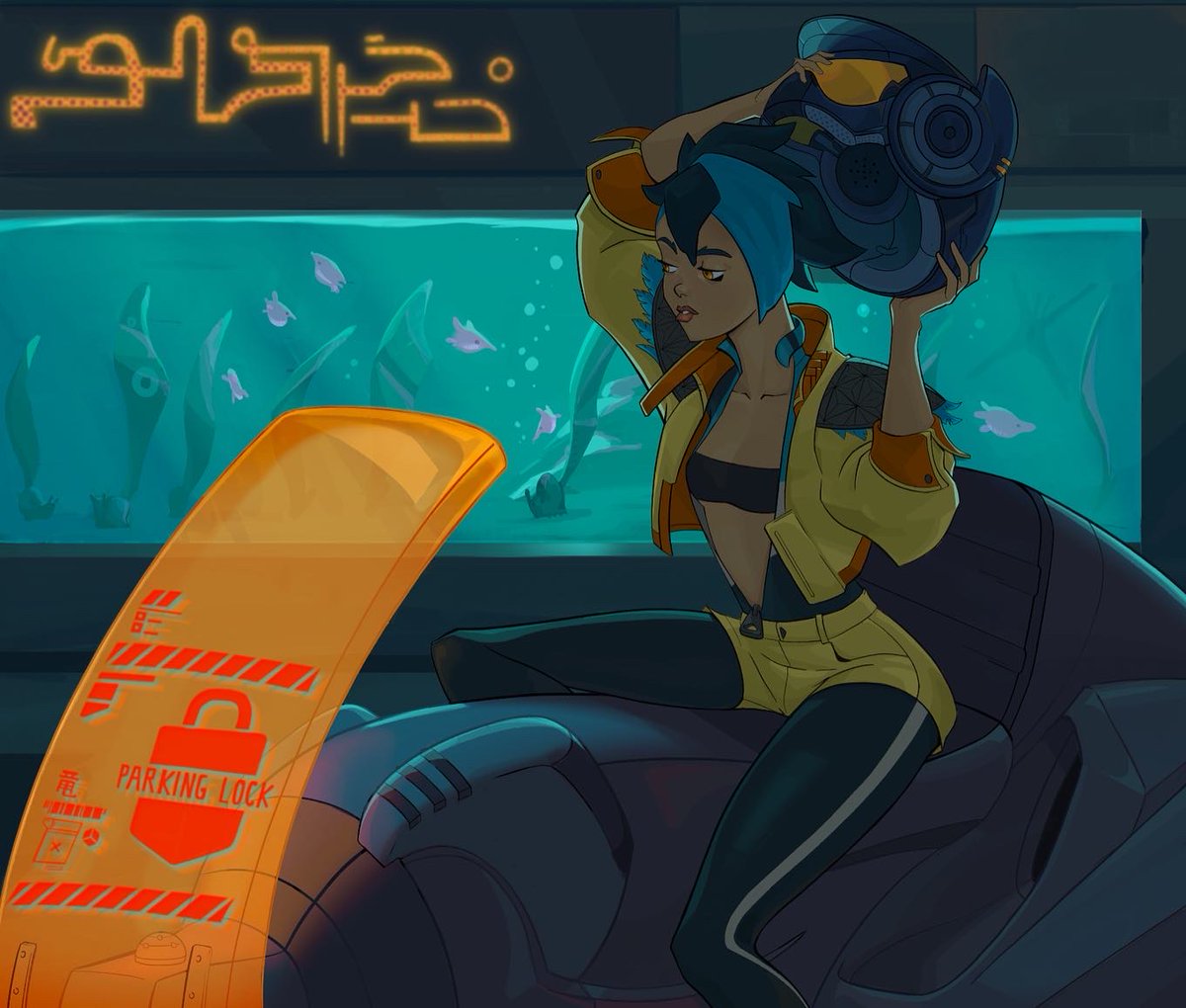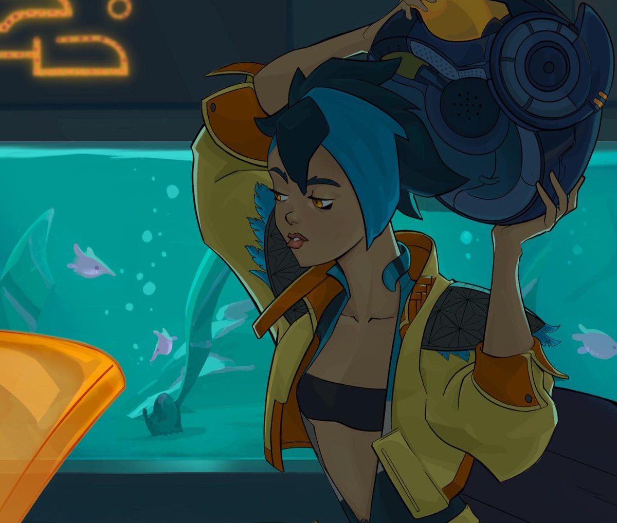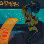 New art of K! Trying to get a vibe for the city - the setting is #Solarpunk at heart, but I love the colors and contrast of cyberpunk. I just want a non-dystopian sustainable future that still looks neon and sexy #artistsontwitter #oc #illustration #procreate #digitalart