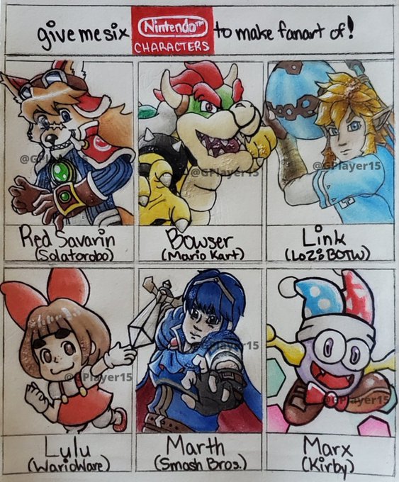 Six #Nintendo fanarts challenge, finally complete! (Separate versions of each character in replies!) #SixFanarts #SixFanartsChallenge #Solatorobo #SuperMario #LegendofZelda #BreathoftheWild #BOTW #WarioWare #FireEmblem #Kirby