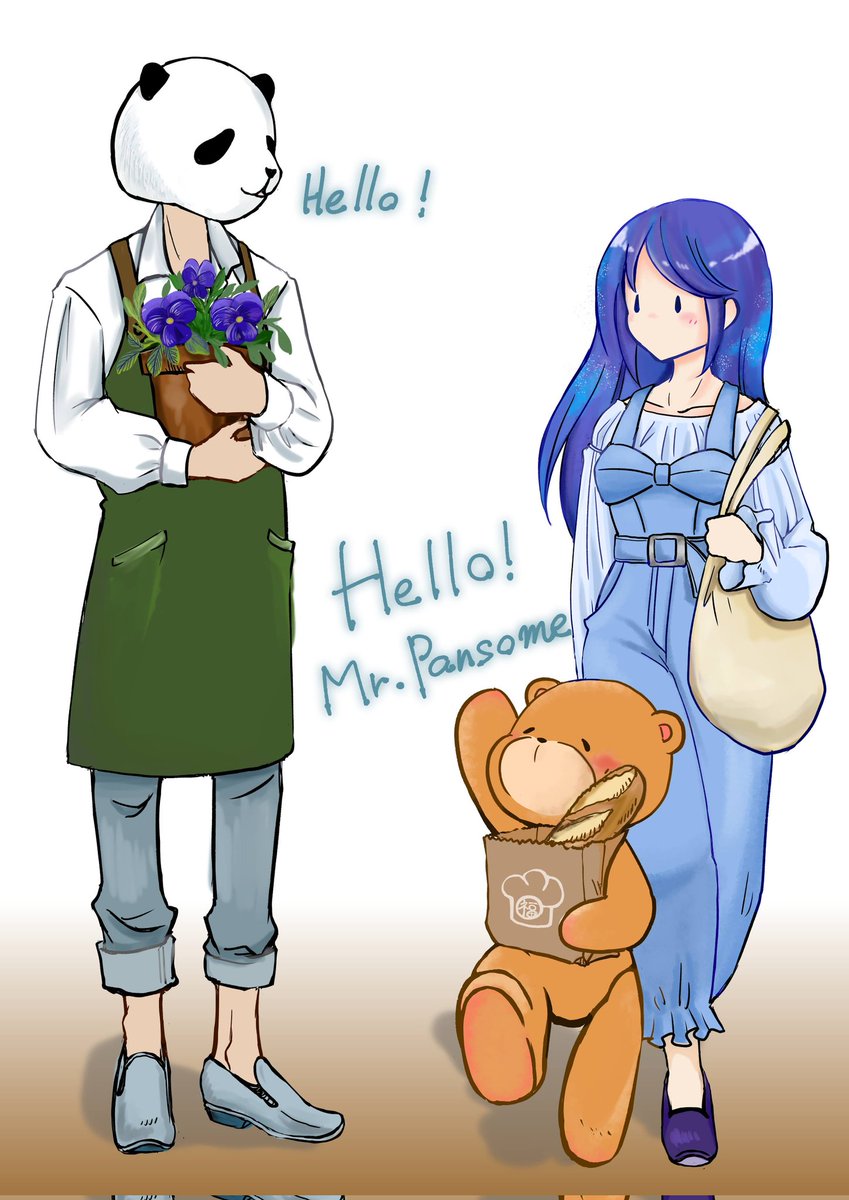 朝色塗りしよーって言いながら、そのまま流れるように色塗りしちゃった。 町中で出会うパンサム氏( @PUnofficially )とくまちゃんとまじょさん。 #ファンアート #パンサム #SOMETHING