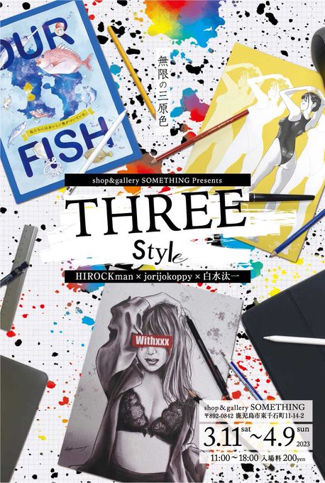 【告知】 白水汰一、HIROCKman、jorijokoppy 「THREEStyle-無限の三原色-」 shop&gallery SOMETHING 2023.3.11-4.9 漫画、イラストレーター、グラフィックデザイナー、3人それぞれの"仕事"をテーマにした展示です! 追加情報も予定してるのでお楽しみに! #kagoshima_art #SOMETHING