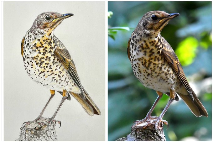 My drawing of a Song thrush and the reference photo ✍️ #Songthrush #bird #drawing #colouredpencils #art #artistsontwitter