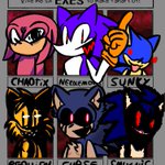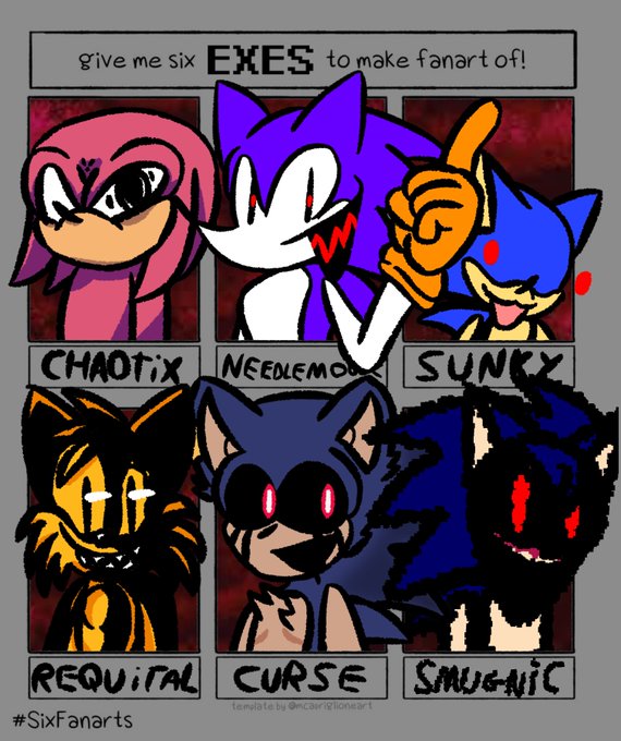 I'm a little late (I think), but fuck it, I had fun making them Chaotix by: @averyavary Needlem0use by: @shutupjojo_ Sunky by: @GirDude Requital by: @Comgamingnz Curse by: @sonic_exe_curse Smugnic by: Me 🧕 Template credits in the image itself #sixfanarts #sonicexe #sonicexefnf
