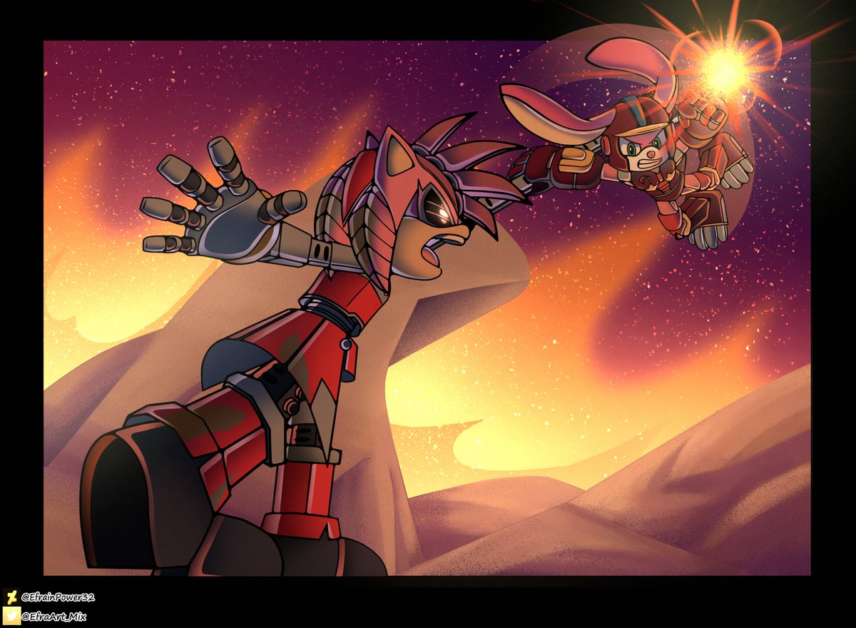 We start with the art of 2023 ^^, this time with the Second big #commission and the last one for the moment, commissioned by @MadmanRB. His #Rabbit, Sunny Rabbiera, against #RustyRose from #SonicPrime #SonicTheHedgehog #SonicPrime #SonicArtist #SonicFC #SonicFanCharacter