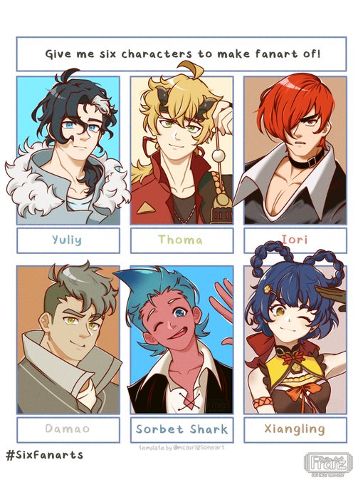 Finally done it!! [ I had fun doing this challenge, I might do it this again in the future!!☺️] #Yuliy #Thoma #Iori #Damao #SorbetsharkCookie #Xiangling #sixfanarts #fanart #digitalart #artwork #Genshinimpact #cookierunkingdom #Allsaintsstreet #ThekingofFighters #SiriustheJaeger