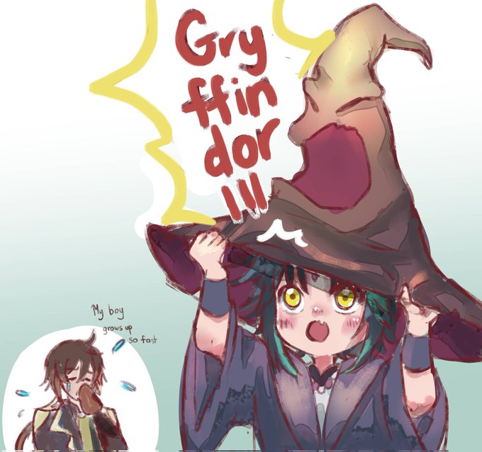 #XIAO #魈 #GenshinImpact #原神 #Halloween #HarryPotter #SortingHat #原神イラスト Happy Halloween!!! I know that smol Xiao's color palette fits perfectly with Slytherin. But I always think that he is a Gryffindor because of his loyalty to Morax ;___;