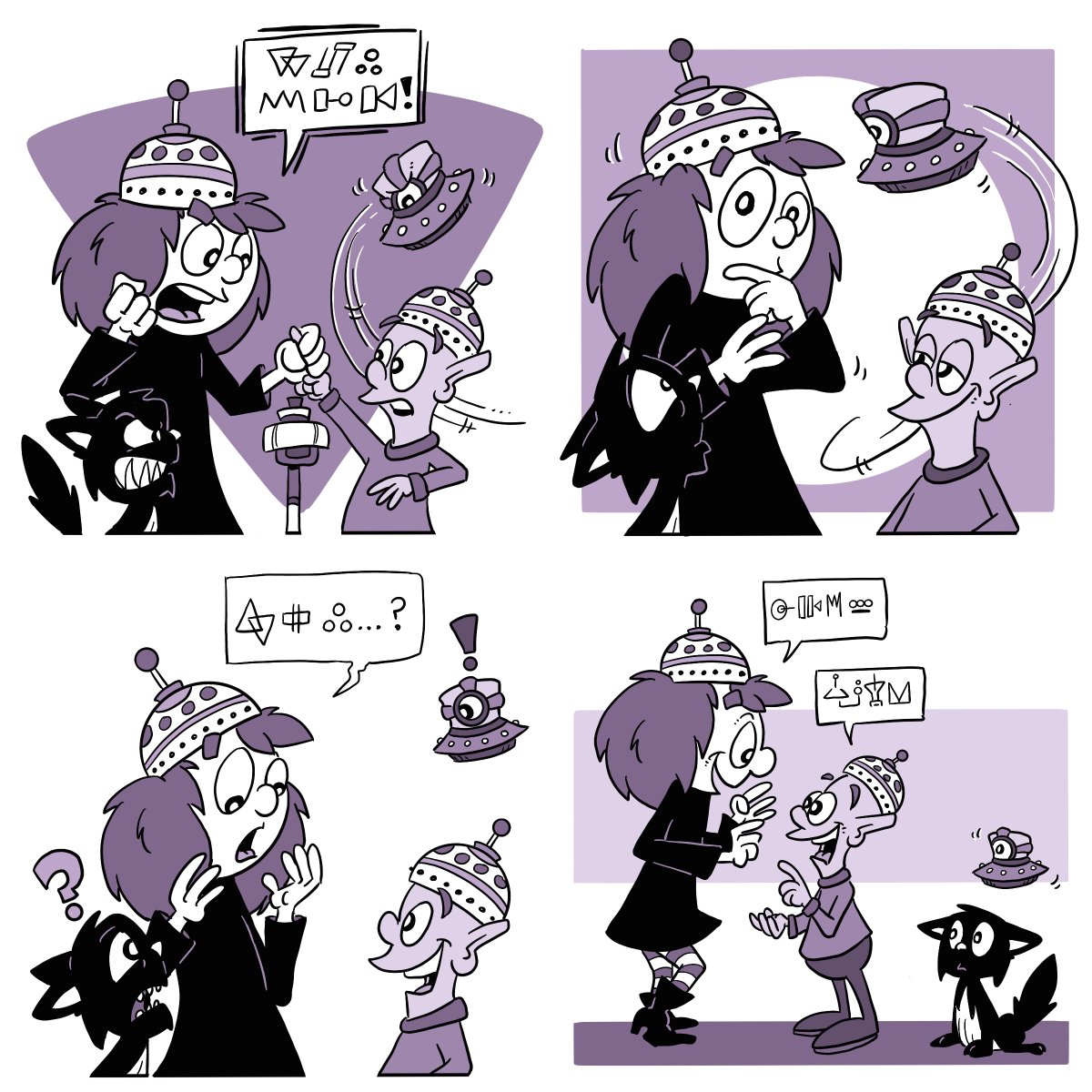 On Day/page 19, Little Witch Willow runs into some communication trouble. #witchtober #witch #blackcat #UFO #spacealien #halloween #drawlloween #childrensbook #childrensbookillustration #inktober