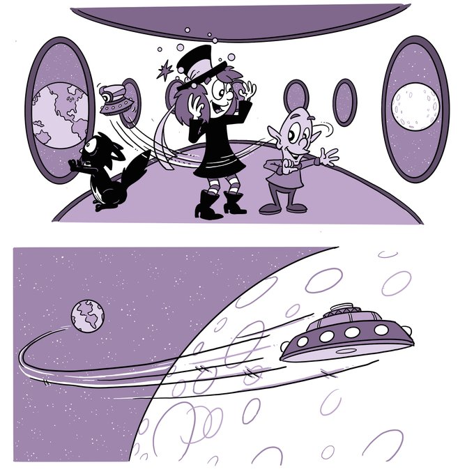 On Day/page 29 of our story, it's time to wave goodbye to a new friend ... but there's still stuff to do! #witchtober #witch #blackcat #ufo #spacealien #moonscape #childrensbooks #childrensbookillustration #halloween #drawlloween #inktober