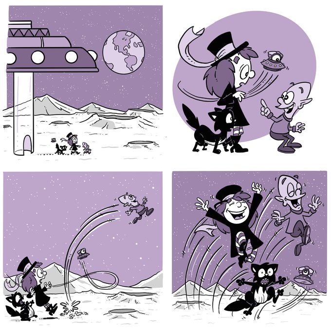 Giant steps are what you take ... on Day/page 25 of Little Witch Willow's Far Out Night Out. #witchtober #witch #blackcat #ufo #spacealien #moon #moonwalk #halloween #childrensbooks #childrensbookillustration #drawlloween #inktober