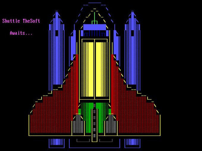 1976 - #NASA unveils the first #spaceshuttle, the #Enterprise Shuttle TheSoft (TheDraw intro screen) circa 1986? 16colo.rs/pack/ansv20/SH… #ansiart #ansi #ascii #asciiart #pixelart #textmode demoscene #bbs #8bit #8bitart #typography #graffiti #graffitiart #space #spaceexploration