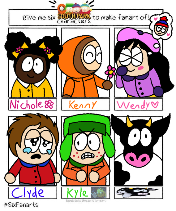 the six #southpark fanarts is complete! other than wendy, these are all characters i've never drawn before. I had a lot of fun with this. #Sixfanarts #spkenny #spwendy #spclyde #spnichole #spkyle #myart