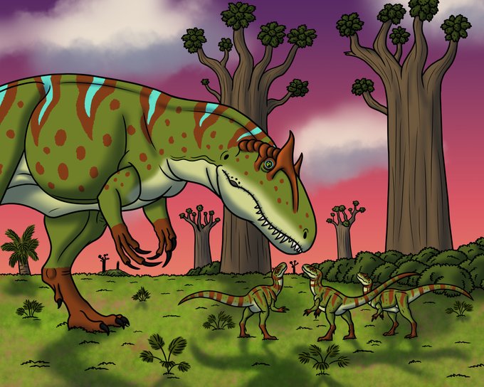 Commission I did for one of my followers, who is working on a sort of "speculative evolution" project. The dinosaurs here are descended from the Cretaceous theropod Neovenator. #dinosaurs #paleoart #specevo #art #artistontwittter