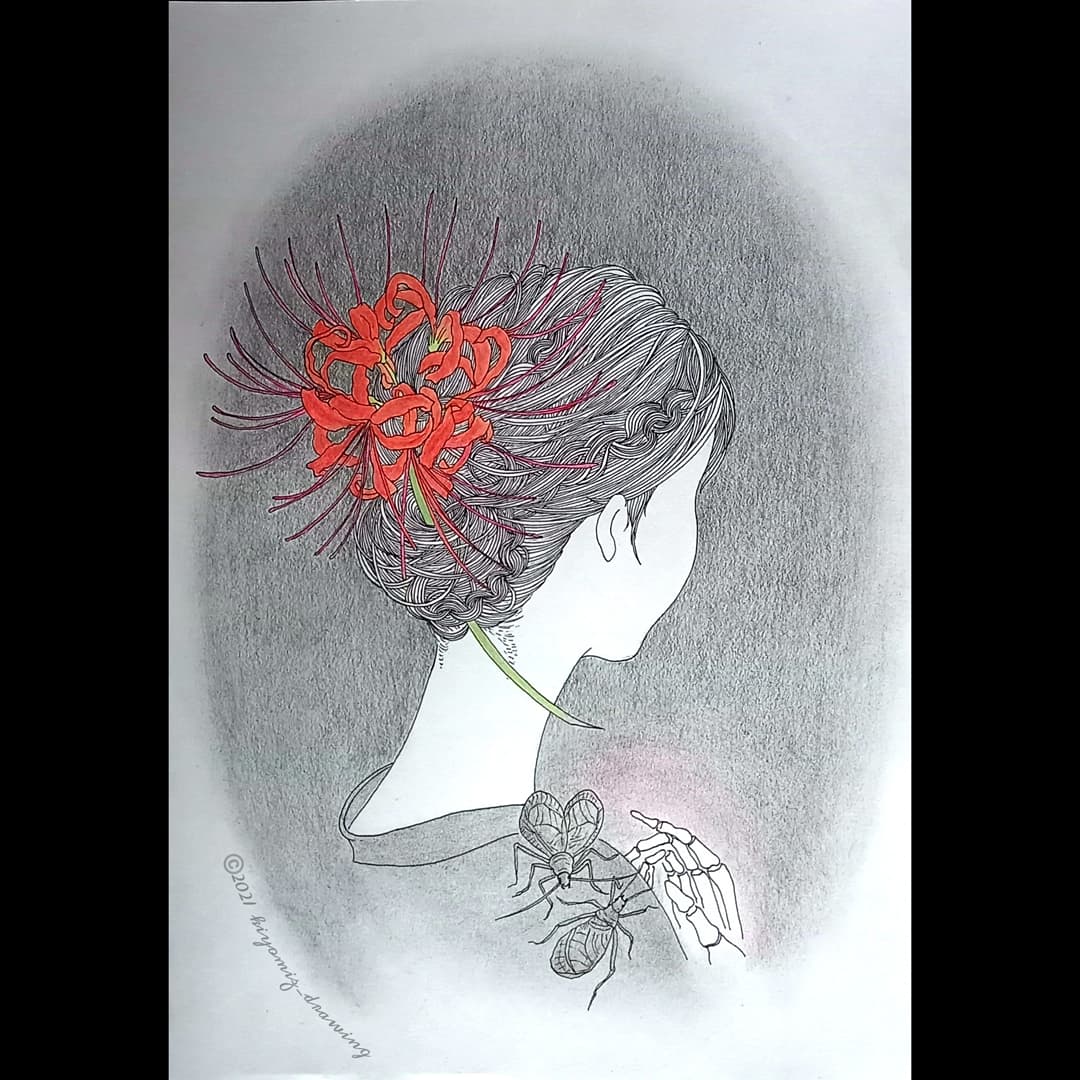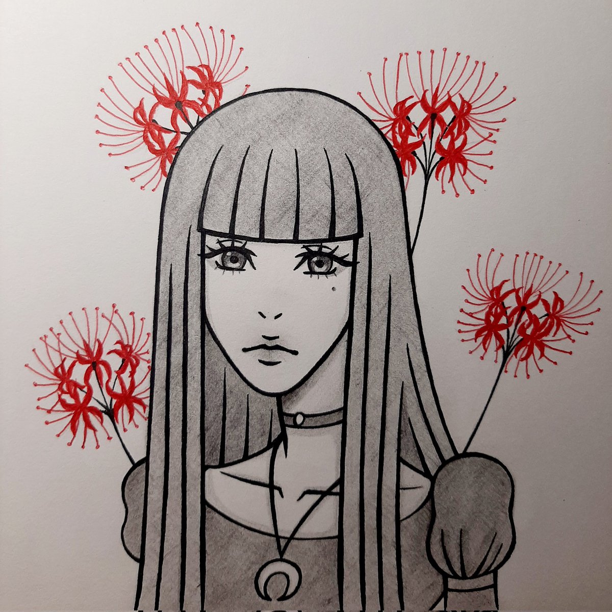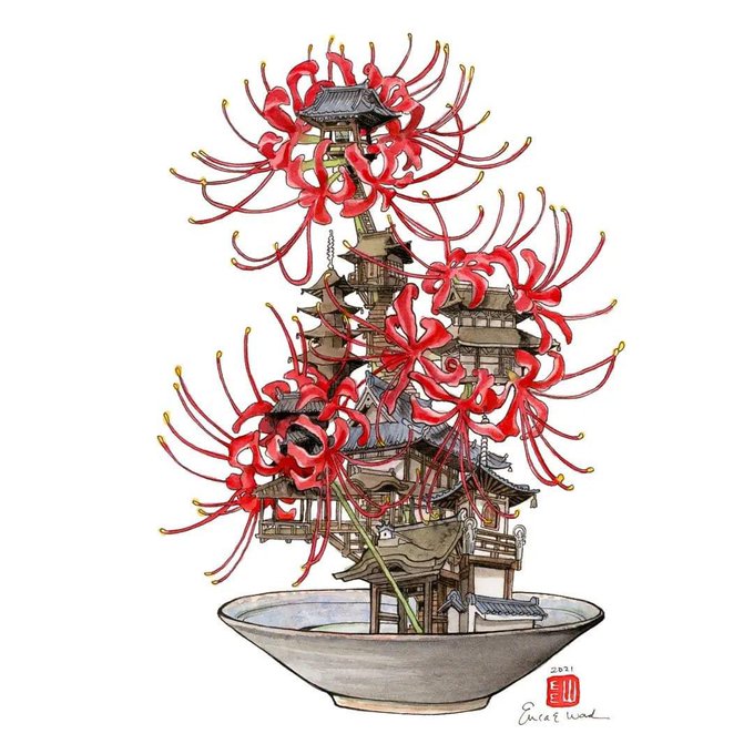 Art by Erica Ward: Inktober Day 2: 「彼岸花の世界」"Spider lilies' world" #tokyo #japanart #artistsofinstagram #inktober #inktober2021 #盆栽 #生け花 #bonsai #ikebana #temple #お寺 #彼岸花 #spiderlily #inktoberday2