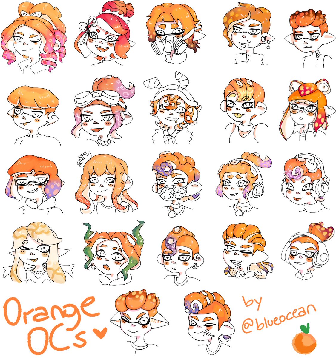 These r all the orange OCs I've drawn! Lmk if u find yours! 🧡🍊 and even if I didn't draw your skrunkly, every single of your submissions made me very happy ❣️thank you everyone 💖 #splatoonart #splatoonocs