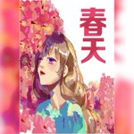 A background with white space; a pink landscape depicts a teenage girl cycling a bicycle covered in sakura flowers while two kanji letters appear. #spring #springday #springdays #springseason #spring2023 #art #artist #artwork #digital #digitalart #digitalartwork #illustration