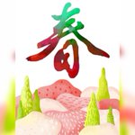 A large landscape depicts pink hills and soft yellow trees along with red and green kanji letters (the color combination of red and green). #spring #springday #springdays #springseason #spring2023 #art #artist #artwork #digital #digitalart #digitalartwork #illustration