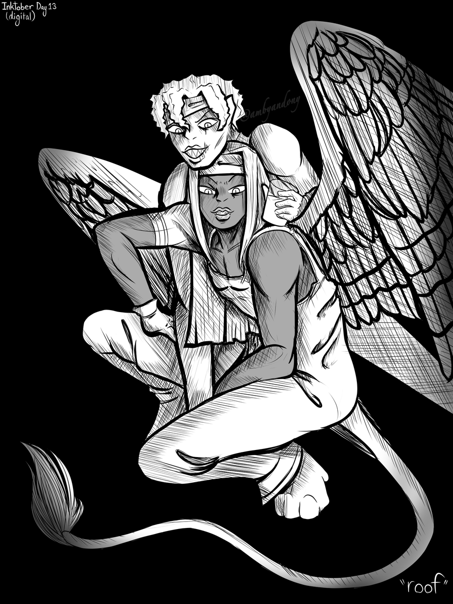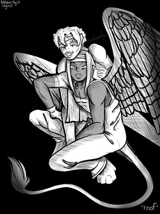 This looks cool until tiziano stretches and hits Squalo in the face w/ ~200 lbs of feathers #inktober Day 13 (“Roof”) #inktober2021 #inktober2021day13 #inktoberday13 #digitalart #fanart #JoJosBizarreAdventure #JJBA #jjbafanart #tizianoandsqualo #squatizi #ventoaureo #goldenwind
