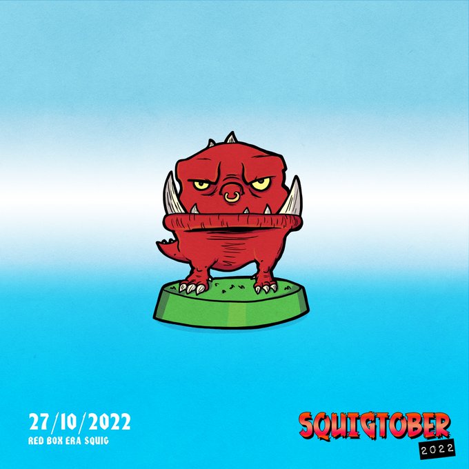 #day27 of #squigtober2022 A bit of a flashback to the early 90s. This is my love letter to the 'Red Box Era' of GW with those plastic sprues in those bright boxes with all the images on a blue backdrop and a goblin green base. #inktober #squigtober #orktober