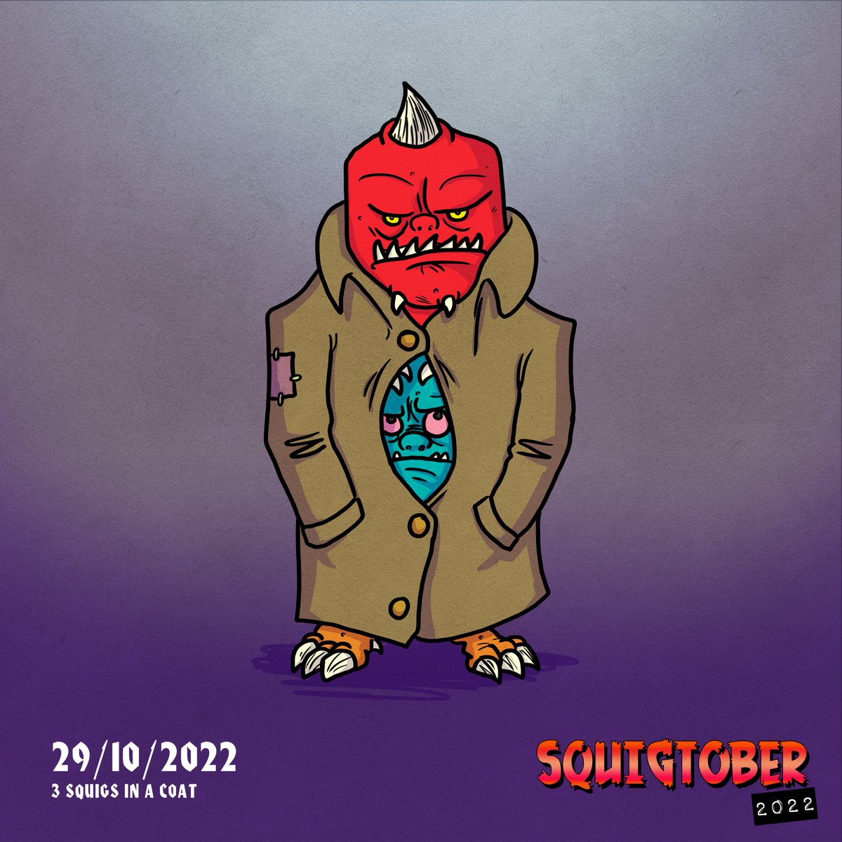 #day29 of #squigtober2022 Always loved the idea of 3 of *thing* in a Trench Coat. Fun fact my nickname at School was 'Squigs'. So I guess this is a self-portrait! #inktober #orktober #squigtober