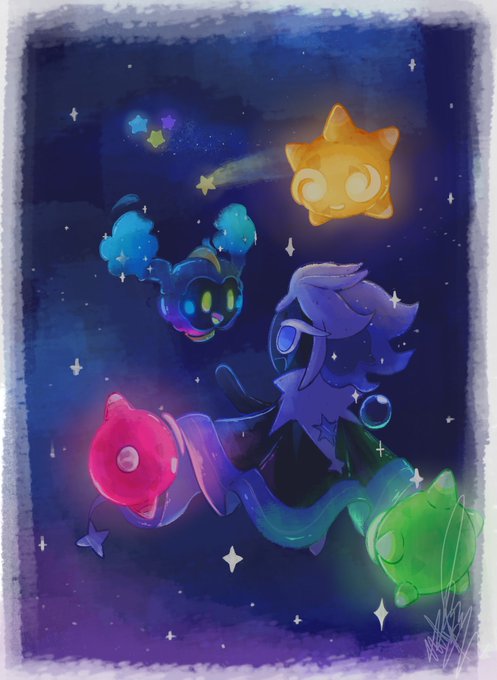 well, the cookie that I drew this time was stardust cookie, actually I do like his design so much. He is such a good super epic, but, well, what do you think abt the pokemon team that I gave him? #Stardustcookie #cookierunfanart #cosmog #minior #pokemonfanart
