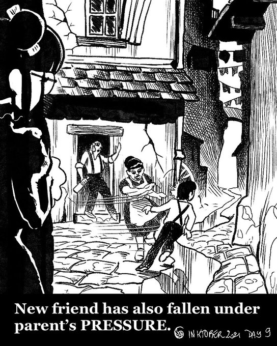 “New friend has also fallen under parent’s pressure.” #inktober #inktober21 #inktober2021 #steampunk #steampunkstyle #steampunkart #artcollaboration #art #comics #sketches #doodle #digitalinking #bw #blackandwhite #comictober #comicsartist #mathilda #pressure #underpressure