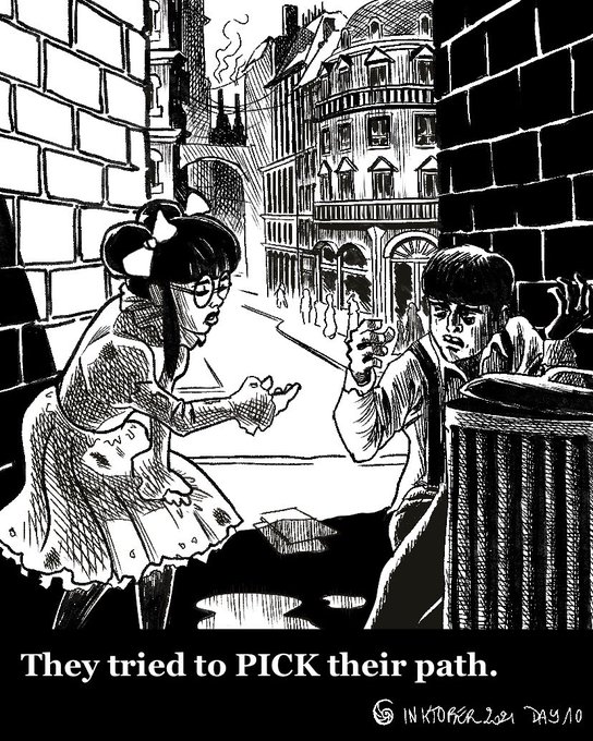 “Life on the streets ain’t easy, you have to watch out!” New week, new chapter and new artist, me ! 😇 #inktober #inktober21 #inktober2021 #steampunk #steampunkstyle #steampunkart #artcollaboration #bw #blackandwhite #comictober #comicsartist #mathilda #frenchinktober #watch