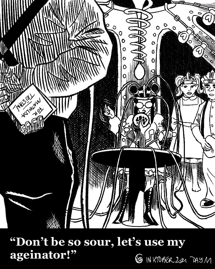 “Don’t be so sour, let’s use my ageinator!” #inktober #inktober21 #inktober2021 #steampunk #steampunkstyle #steampunkart #artcollaboration #art #comics #sketches #doodle #digitalinking #bw #blackandwhite #comictober #comicsartist #mathilda #frenchinktober #sour