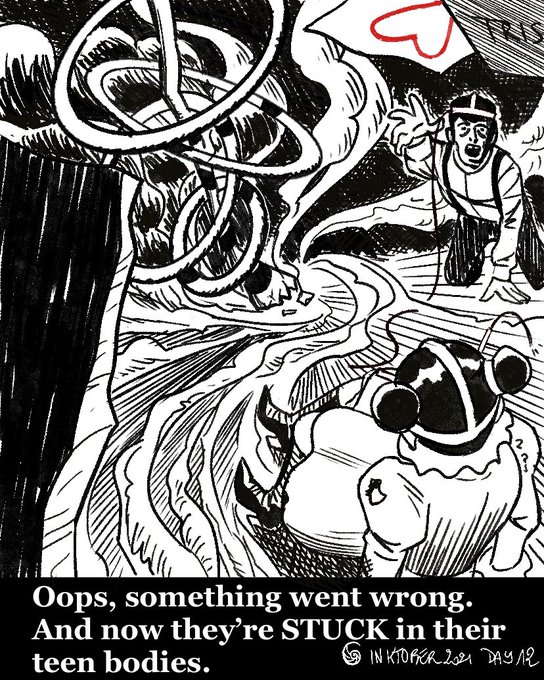 “Oops, something went wrong. And now they’re STUCK in their teen bodies.” #inktober #inktober21 #inktober2021 #steampunk #steampunkstyle #steampunkart #artcollaboration #art #comics #bw #blackandwhite #comictober #comicsartist #mathilda #frenchinktober #stuck