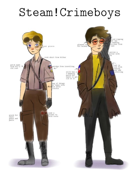 1st set of steampunk au character designs. Had to start off with crimeboys obviously. Also I have started writing. AND THE AU HAS A NAME. "SteamRolled" #tommyinnitfanart #wilbursootfanart #crimeboysfanart #steamrolledau
