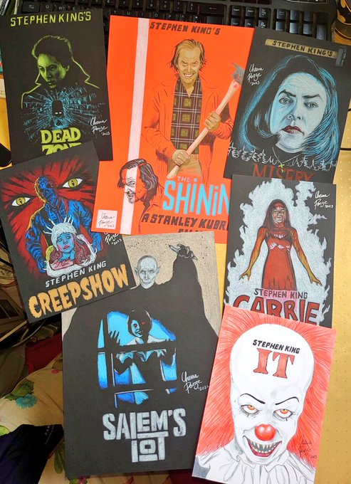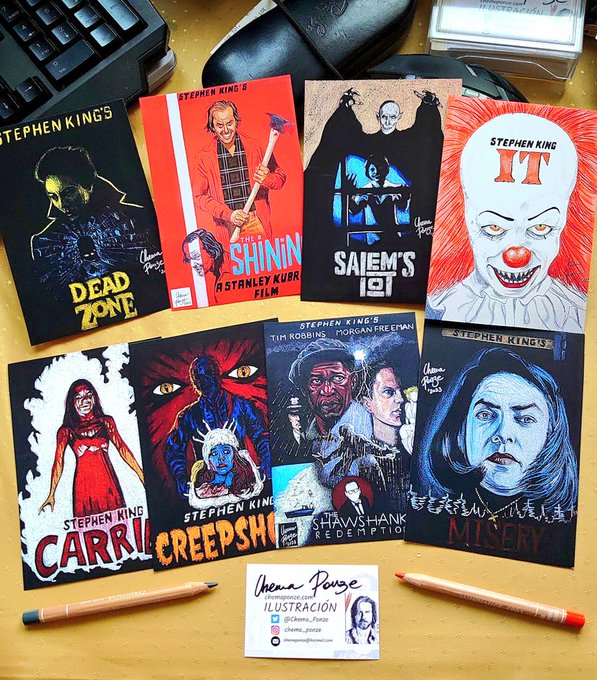 ¡Ya está aquí el PACK STEPHEN KING! Buenos días y feliz Martes, tras muchas horas de trabajo aquí está el pack de ilustraciones que he dedicado a #StephenKing. 8 prints 10x15 en papel de 300 grs, 20€/envío incl. Interesados por DM o en chemaponze.com/tienda/PACK-TH… @Stephenkingesp2