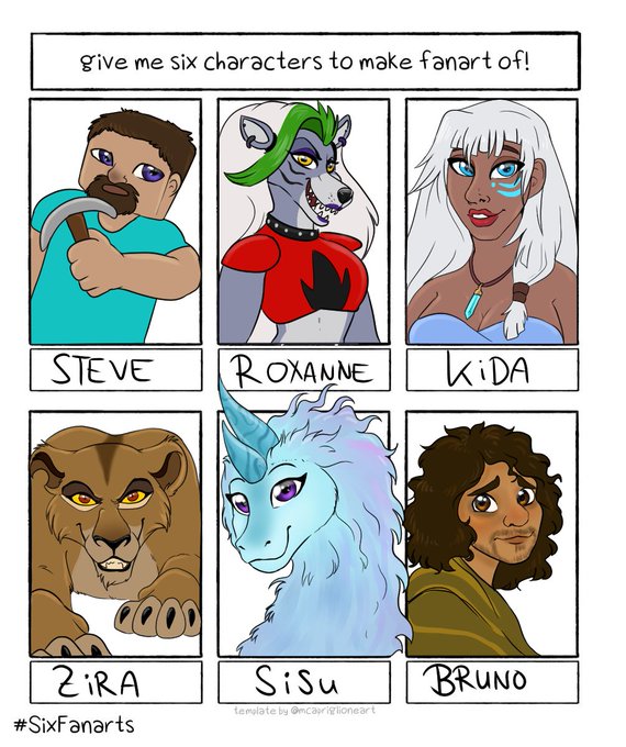 Did the #SixFanarts thing too! Not my best stuff but it was fun :D #steve #minecraft #fnaf #roxanne #kida #atlantis #zira #thelionking #sisu #rayaandthelastdragon #bruno #encanto