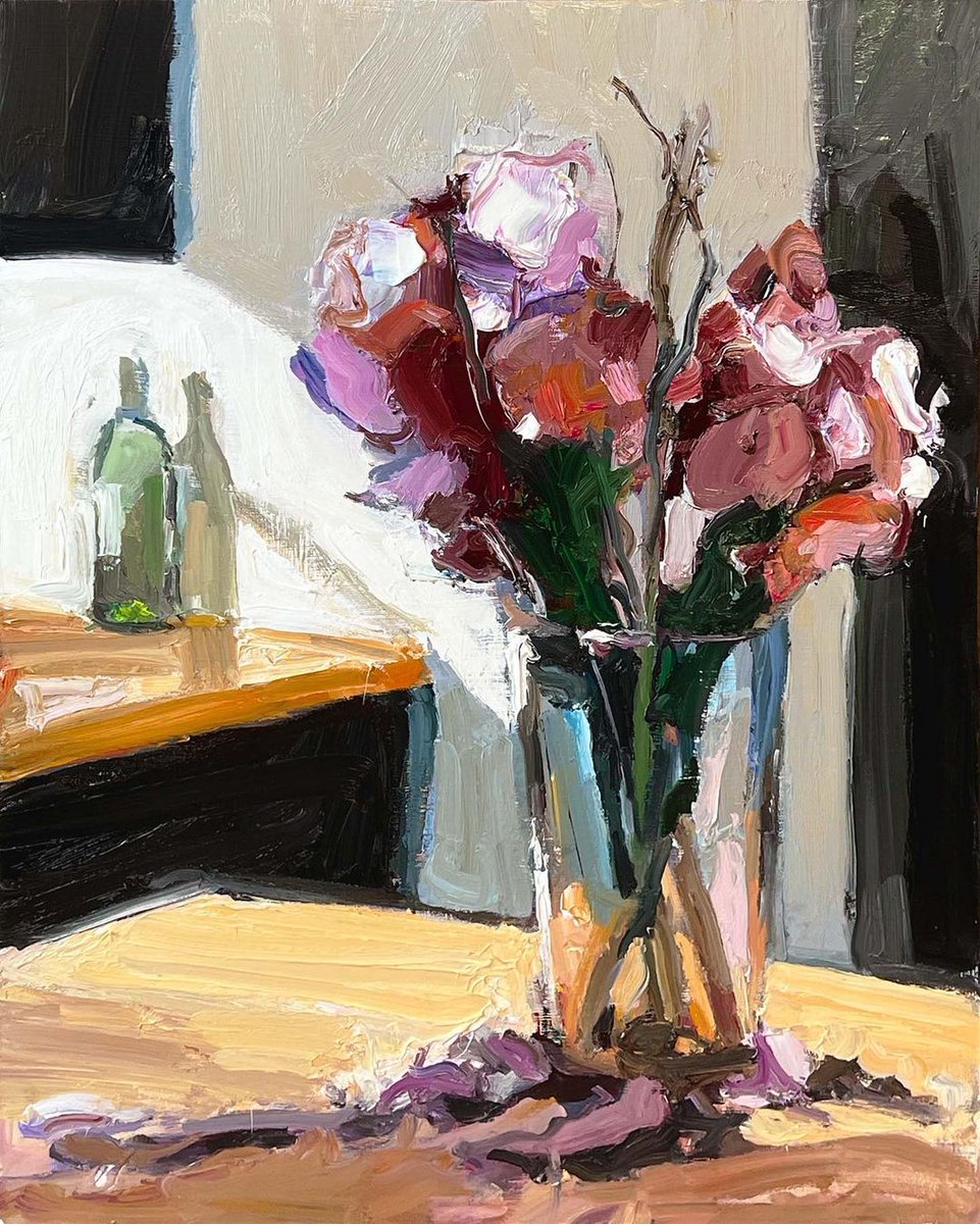 There’s something poignant about returning home after a trip to find your flowers in a state of semi-decay. Time recorded in falling petals. “Time Falling Away, Time Moving Behind Us”, 35X45cm, oil on board. #stilllifepaintings #floralpainting #dailypainting #artfordesigners