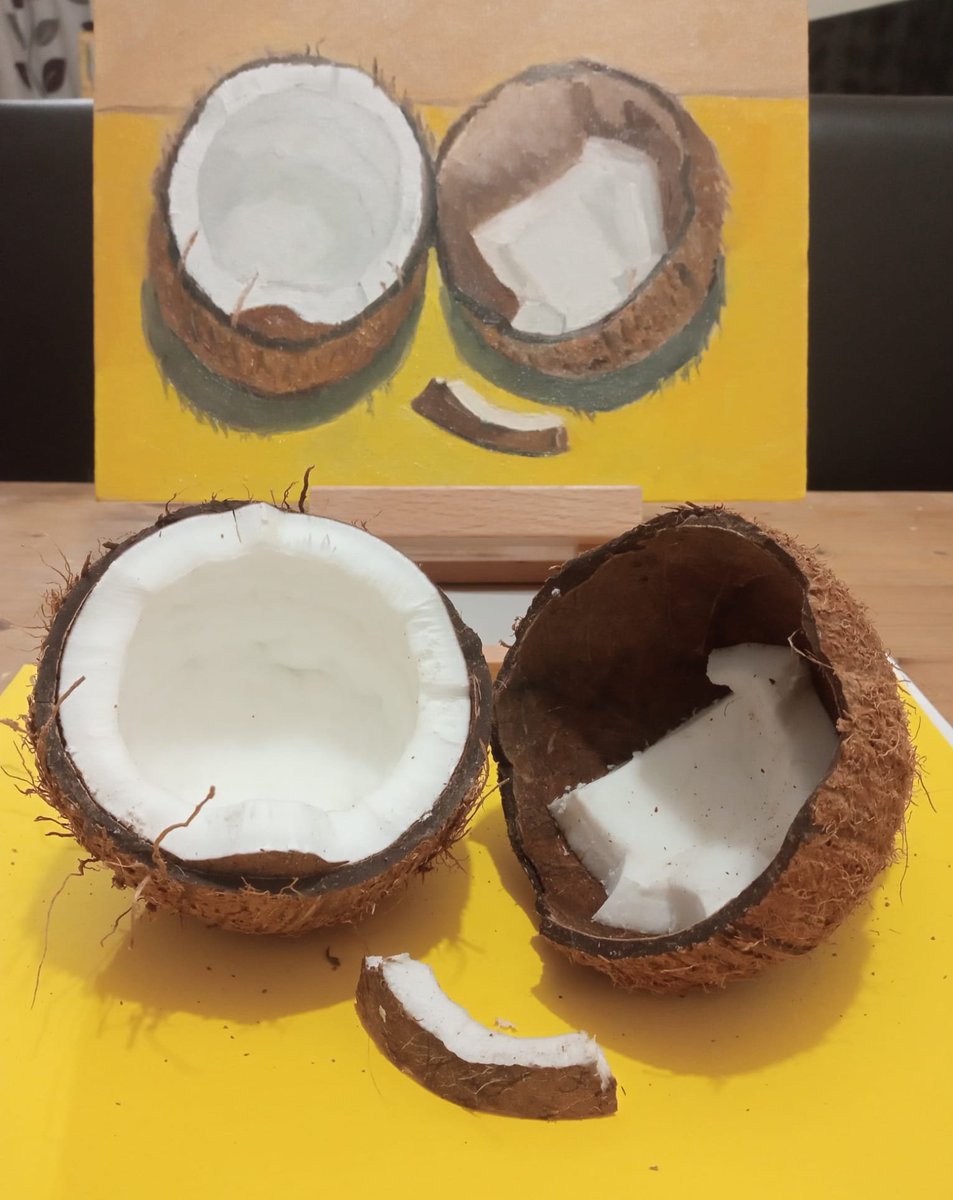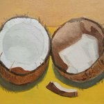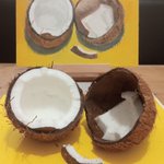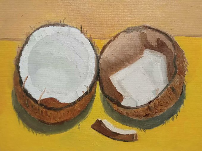 'In a Nutshell' - Day 6 of #stradaeasel. Purchase now from: dailypaintworks.com/Artists/prema-… #artistontwitter #art #artist #artvsartist #artforsale #dailypainting #commissionsopen #artseller #artgallery #stilllife #artlover #interiordesign #homeinspo #kitchenart #coconut #tropical #nuts
