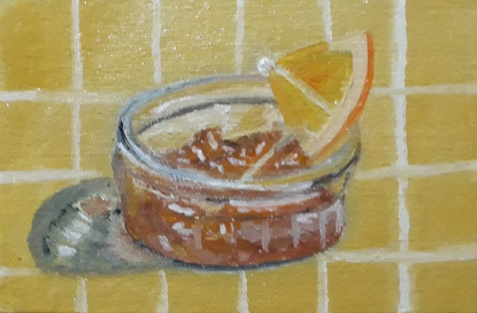'Marmalade' - Day 7 of #stradaeasel. Purchase now from: dailypaintworks.com/Artists/prema-… #artistontwittter #art #artist #artvsartist #artforsale #marmalade #dailypainting #commissionsopen #artseller #artgallery #stilllife #artgallery #interiordesign #paddingtonbear #fridayfeeling #glass