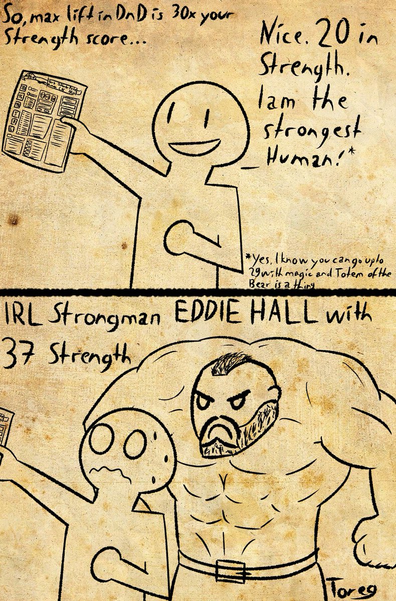 Some things in DnD don't scale well. Max. Lift, Push and Drag is one of them imo. For those who don't know, @eddiehallWSM is the first man to ever deadlift half a ton. Hope you get a chuckle out of this, i certainly had when drawing it. #dndart #dndmemes #strongman